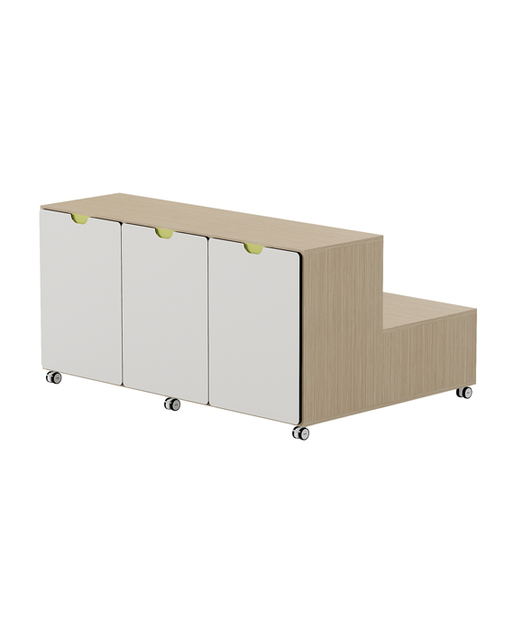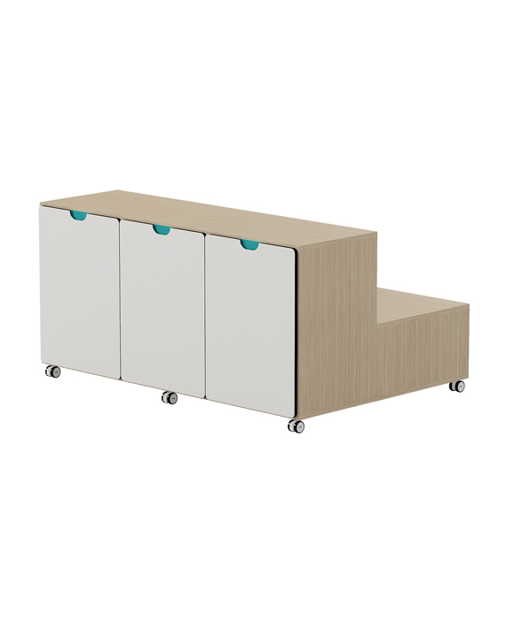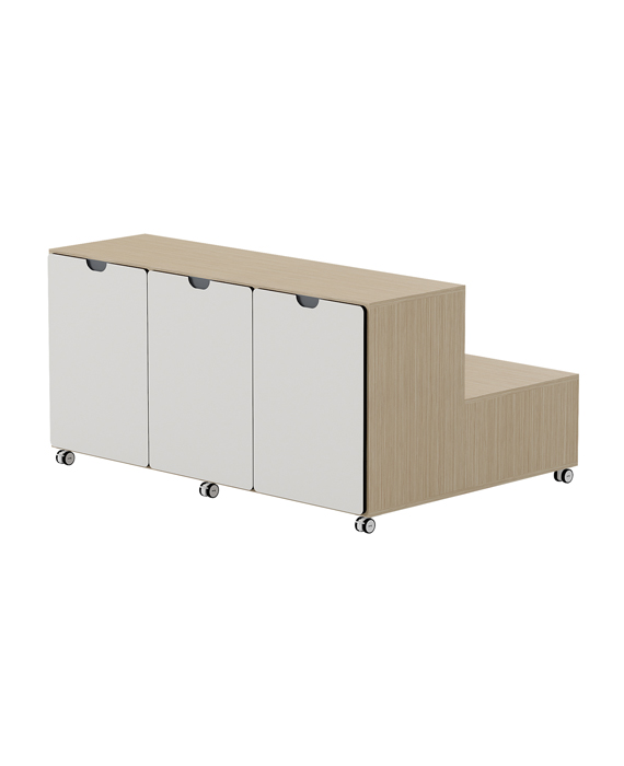 Grada Ágora Versa: minimalista y robusta. Superficie de fenólico y puertas de CDF sin aristas vivas y diseñada para un uso prolongado. Idónea para la educación colaborativa. Se entrega totalmente montada. Se pueden añadir las puertas que se necesiten a la parte trasera. Ruedas con frenos. Almacenaje para pufs.