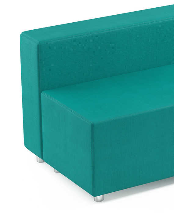 Asiento en espuma recubierta de polipiel retardante al fuego en color gris y turquesa. Espuma de alta densidad y rápida recuperación.