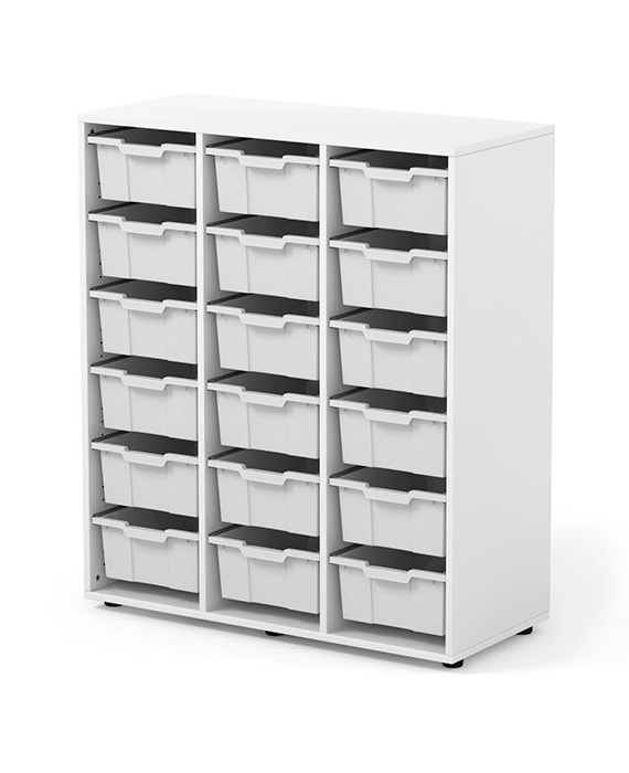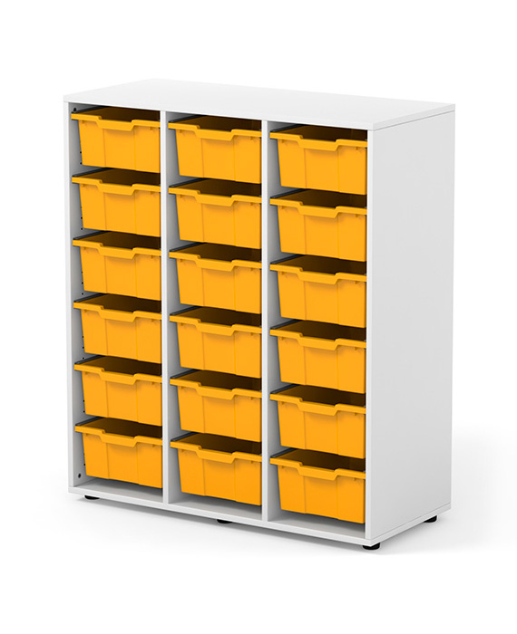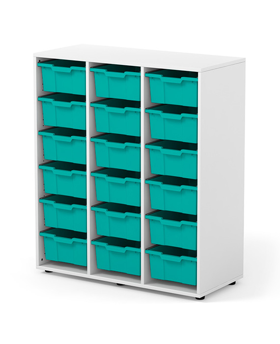 Armario Sophie: armario escolar abierto de tres columnas para almacenar hasta 33 cubetas. Ideal para equipar clases de aprendizaje cooperativo.